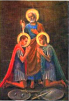 Per la leggenda, Nereo e Achilleo erano i servitori di Flavia Domitilla, nipote dell’Imperatore Domiziano, della nobilissima famiglia dei Flavi, figlia della matrona cristiana Plautilla. Convertiti dallo stesso San Pietro durante la sua permanenza a Roma, Nereo e Achilleo convinsero la fanciulla a rifiutare le nozze con il figlio di un console, per serbarsi fedele al voto di castità . L’innamorato respinto avrebbe spronato l’Imperatore Domiziano a punire quei riottosi cristiani, e Flavia Domitilla, sarebbe stata esiliata così nell’isola di Ponza, insieme con i servitori Nereo e Achilleo. Più tardi, sotto Traiano, i tre cristiani sarebbero stati costretti a fuggire a Terracina, e qui Nereo e Achilleo rifiutandosi ancora di convincere Domitilla al matrimonio, sarebbero stati condannati a morte mediante decapitazione. I loro corpi sarebbero stati riposti, a Roma, in una cripta lungo la via Ardeatina, di proprietà di Flavia Domitilla, presso la sepoltura di Aurelia Petronilla. E qui sul luogo della sepoltura, storia e leggenda si incontrano, perché la basilica sotterranea dedicata ai Santi Nereo e Achilleo esiste veramente lungo la via Ardeatina, ed è menzionata in documenti antichissimi. I corpi dei due Martiri sono stati effettivamente ritrovati, nel tardo ‘500, e più recentemente sono state ritrovate altre prove del loro culto, risalente almeno al IV secolo, come è stata ritrovata la sepoltura di Aurelia Petronilla, contrassegnata da un dipinto.
