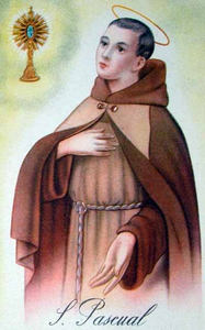 Quando suonava la campana del vicino convento francescano, il ragazzo finiva con le pecore presso quelle mura per condividere la preghiera dei frati. Presentò domanda per entrare nella vita religiosa, ma non fu accettato… Qualche tempo dopo, però, per la sua fama di bontà , fu finalmente accolto nel convento di Montfort a Valencia come fratello laico. Fra Pasquale fu subito occupato in portineria e nella questua, uffici modestissimi che prese ad esercitare alla perfezione. Egli possedeva il suo unico tesoro nell’Eucarestia: fedelissimo ai suoi doveri, partecipava ogni mattina alla Santa Messa con la Comunione e tornava alla sera in chiesa per la visita al SS.mo Sacramento. Tutto il tempo libero, spesso anche durante la notte, lo trascorreva davanti al tabernacolo, in profonda e dolcissima adorazione. Quando si recava in un altro paese o città , per prima cosa andava a far visita a Gesù Eucaristico. Durante la consacrazione della Messa andava in estasi e, a volte, si levava in alto da terra… La sua affezione all’Eucarestia diventò trascinante e si formò attorno a lui un numeroso gruppo di anime che si univano nell’adorazione eucaristica per la salvezza del mondo. Era il tempo in cui i protestanti (luterani,, calvinisti…) negavano il dogma della presenza reale di Gesù nell’Eucarestia. Durante un viaggio a Parigi, fra Pasquale affrontò in una serie di dispute alcuni calvinisti agguerriti, meravigliando tutti per la profondità della sua dottrina. La gente stupita si domandava: “Ma non è l’umile illetterato fraticello laico di Montfort?”. La sua morte, avvenne il 17 maggio 1592, giorno di Pentecoste.