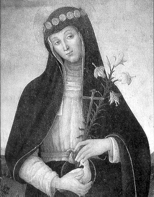 Era nata nel 1467, da un piccolo commerciante di panni di Rieti. Fu battezzata con il nome di Angela, ma per una bianca colomba che svolazzò sul fonte durante la cerimonia, tutti la chiamarono Colomba. Fidanzata poco più che bambina, trovò la forza di rifiutare il matrimonio. Questo destò, a Rieti, scandalo e riprovazione, e costò alla piccola Colomba minacce e battiture. Attratta dalla luce mistica di Santa Caterina decise di diventare domenicana. Entrò nel Terz’Ordine, ma di nuovo fece scandalo il suo desiderio di ricevere la comunione frequentemente, le sue estasi, i suoi incredibili digiuni. Un giorno, misteriosamente scomparve di casa. Giunse - non si sa come - a Perugia.