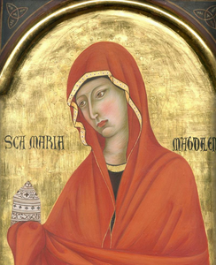 Maria “Maddalena”, cioè oriunda di Magdala in Palestina, si pose al servizio di Gesù, dopo essere stata guarita da lui da sette demoni (Lc 8,2) (= possessione diabolica oppure un grave male interiore o esteriore). La troviamo tra le donne che seguono Gesù, accompagnandolo nella sua missione, con la loro collaborazione. I passi del Vangelo che parlano di Maria di Magdala, la presentano ardente di fede e di amore per il Signore, disposta a qualsiasi sacrificio per Lui. Non si può identificarla con la peccatrice perdonata da Gesù in casa del fariseo (Lc 7,36-50), o con Maria sorella di Lazzaro e di Marta. Maria Maddalena partecipò alla sepoltura del Corpo di Gesù e fu la prima a riconoscere Gesù dopo la sua risurrezione, così come racconta l’evangelista Giovanni: “Maria stava all’esterno, vicino al sepolcro e piangeva. Mentre piangeva si chinò verso il sepolcro e vide due angeli in bianche vesti, seduti l’uno dalla parte del capo e l’altro dei piedi, dove era stato posto il Corpo di Gesù. Ed essi le dissero: “Donna perché piangi?”. Chi cerchi?”. Essa, pensando che fosse il custode del giardino, gli disse: “Signore, se l’hai portato via tu, dimmi dove lo hai posto e io andrò a prenderlo”. Gesù le disse: “Maria!” Essa allora voltatasi verso di lui, gli disse in ebraico: “Rabbunì!” che significa: “Maestro!”. Gesù le disse: “Non mi toccare, perché non sono ancora salito al Padre, ma va’ dai miei fratelli e di’ loro: Io salgo al Padre mio e Padre vostro, Dio mio e Dio vostro. Maria di Magdala andò subito ad annunciare ai discepoli: “Ho visto il Signore” e anche ciò che aveva detto” (Gv 20,1.11-18).