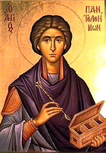 San Pantaleone, secondo la tradizione, nacque in una famiglia agiata. Suo padre era pagano, mentre sua madre era cristiana. Tuttavia non ricevette il battesimo. Ebbe una buona educazione classica e apprese l’arte del medico, acquisendo rapidamente una certa fama. Si convertì al cristianesimo e si dice che operò guarigioni miracolose. Si dice anche che esercitava la sua professione senza chiedere alcun compenso. Subì il martirio sotto Diocleziano, probabilmente a Nicomedia, intorno al 305. La fama del martire di Bitinia si diffuse anche in Occidente. Il culto di questo martire era connesso principalmente con la Bitinia, dove l’imperatore Giustiniano ricostruì la sua chiesa a Nicomedia; ma non sono sopravvissuti particolari autentici sul suo conto. Presto nacquero leggende su di lui, secondo le quali era medico di corte dell’imperatore Galerio e fu sottratto a una vita sregolata da un amico cristiano; quando fu arrestato durante la persecuzione di Diocleziano si tentò invano di metterlo a morte in modi diversi, fino a che non si riuscì a decapitarlo. A causa della sua pretesa professione S. Pantaleone divenne un popolarissimo patrono dei medici; una presunta reliquia del suo sangue, conservata a Revello nell’Italia meridionale, presenta il fenomeno della liquefazione.