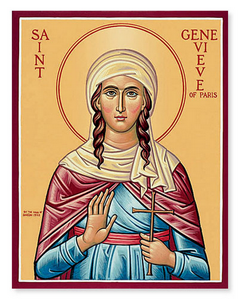 Era al colmo della fama quando morì, sugli ottant’anni, al compiersi del primo mezzo millennio dell’era cristiana. Sepolta in una chiesa dedicata a San Pietro, il suo nome oscurò quello dell’Apostolo, e la chiesa venne chiamata di Santa Genoveffa. Per quanto i Giacobini, nel 1793, tentassero di sbarazzarsi di Santa Genoveffa, bruciandone le reliquie e disperdendone le ceneri, la venerazione per la Patrona di Parigi non si spense né si affievolì, e il suo ricordo viene ancora celebrato, sulle rive della Senna. Nell’arte è raffigurata come una pastorella, di solito con in mano una candela che un diavolo tenta di spegnere mentre un angelo vi fa la guardia.