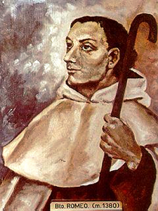Come molti altri nomi medievali, “romeo” è in origine un aggettivo, derivante da Roma. Si chiamavano così i pellegrini che, da ogni parte della Cristianità , si dirigevano verso Roma, per visitare la tomba degli Apostoli, e soprattutto per venerare il lino della Veronica, sul quale la tradizione diceva che fosse restata impressa l’orma sanguinante del Volto del Redentore. Proprio l’immagine del lino della Veronica costituiva il “distintivo” dei Romei. Si chiamava “Romea” anche la strada che, dal settentrione conduceva verso Roma, passando da Lucca. Dante, nella Divina Commedia, ricorda la folla dei Romei che percorreva nei due sensi il Ponte Sant’Angelo, a Roma, nel primo anno santo. Anche il Beato Romeo, oggi festeggiato, visse nel secolo di Dante e delle contese tra Montecchi e Capuleti. Egli fu italiano di origine, e certo è che appartenne all’antichissimo ordine religioso dei Carmelitani, devoti della Madonna, che proprio in quel secolo conobbero, nelle città italiane, una nuova rigogliosa fioritura di vocazioni e di fondazioni.