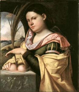 Siamo a Catania, nel III secolo, al tempo della persecuzione dell’imperatore Decio, verso il 250. Agata, il cui nome greco significa “buona”, è una giovanissima cristiana di nobile e agiata famiglia. E’ assai bella e gentile. La sua fede, il suo amore a Cristo sono invincibili, come nei giovani delle prime generazioni cristiane. Il console Quinziano, pagano di religione, si invaghisce di lei e la chiede in sposa. Agata, il cui cuore è tutto occupato dall’amore al Signore Gesù, rifiuta ripetutamente, senza farsi intimorire, pur sapendo che cosa può aspettarla. Quinziano la lusinga con le proposte più allettanti, viste inutili le quali, passa alle minacce più terribili. Agata rifiuta di rinnegare Gesù e di andare a nozze con quell’uomo. Quinziano tramuta il suo amore in odio e la fa rinchiudere in carcere e la sottopone alle più crudeli torture. Infine le chiede ancora di sacrificare alla dea Vesta e, per farla soccombere, la abbandona con una donna di malaffare. Nulla può farla cedere, perché Agata, come tutti i martiri, è sorretta dalla fede e dalla grazia di Cristo. Allora è mandata a morire consumata dal fuoco lento dei carboni ardenti, arsa viva tra la commozione del popolo di Catania. Dal giorno del suo martirio, la città le è assai devota, come a sua protettrice e patrona. La devozione a lei si accresce quando, a un anno dalla sua morte, una improvvisa eruzione dell’Etna minaccia Catania. Il popolo terrorizzato invoca con fede l’intercessione della giovane martire affinché risparmi la città dall’orribile distruzione. E la lava incandescente si arresta proprio davanti alle porte della città . Da allora, Agata è invocata ogni volta che si teme un’eruzione vulcanica. Il suo nome, insieme a quello di altri martiri e vergini cristiane, entrò presto nel Canone Romano, la più antica e venerabile preghiera eucaristica con cui viene celebrato il santo Sacrificio della Messa. Nel secolo V, papa Simmaco le dedicò a Roma sulla via Appia una basilica e il suo culto si estese a tutta la Chiesa. E’ patrona di Palermo e di Catania.