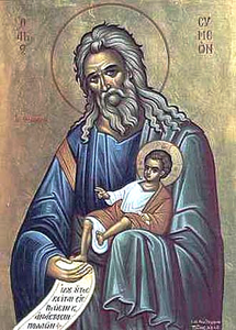 San Simeone è il Santo della Presentazione di Gesù al tempio. Rileggiamo questo episodio evangelico nelle pagine di Luca, l’unico tra gli evangelisti che ce ne parli. «C’era a Gerusalemme un uomo di nome Simeone, persona giusta e pia, che aspettava la consolazione d’Israele. E su di lui era lo Spirito Santo, il quale gli aveva rivelato che egli non sarebbe morto prima di vedere il Cristo del Signore. Venne dunque al Tempio, guidatovi dallo Spirito, e quando i genitori vi portarono il Bambino, per adempiere nei suoi riguardi alle usanze legali, anch’egli lo prese tra le braccia, e benedisse Dio, esclamando: “Ora lascia pure, o Signore, che il tuo servo se ne vada in pace, secondo la tua parola; perché gli occhi miei hanno veduto la tua salvezza, da Te preparata al cospetto di tutti i popoli; luce per illuminare le genti e gloria del popolo tuo, Israele. Il padre e la madre restavano meravigliati delle cose che si dicevano del Bambino. Simeone li benedisse, e disse a Maria, sua madre: “Questo bambino è destinato ad essere causa di rovina e di risurrezione di molti in Israele, e a diventare segno di contraddizione. A te stessa, una spada trapasserà l’anima, e così saranno rivelati i pensieri di molti cuori”». Il Martirologio Romano qualifica Simeone come “vecchio”, e come tale è stato rappresentato da tutta l’arte e la letteratura cristiana. E’ probabile che aspettasse da lungo tempo il Salvatore, e la sua carne fosse ormai stanca. Così si spiega lo struggente abbandono del suo cantico, il Nunc dimittis: “Ora lascia, o Signore, che il tuo servo se ne vada in pace...”. E’ stato scritto che questo cantico di Simeone “ha la poesia del tramonto di una bella giornata”, ed è tanto più toccante quanto più si immagina il suo autore, curvato dagli anni e dalle prove. Simeone non è soltanto il vecchio uomo, ma il vecchio tempo, che vive però abbastanza a lungo per vedere l’alba del tempo nuovo. Egli misura la vecchiezza del mondo, che sarebbe fatalmente stanchezza se non fosse consolata e vivificata dall’annunzio di vita nuova, costituita dal Figlio di Maria, nato da pochi giorni.
